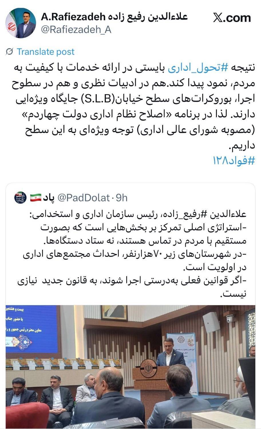 🔹بانشر پیام دکتر علاءالدین رفیع زاده رئیس سازمان اداری و استخدامی کشور در شبکه ایکس در خصوص ابلاغ دستور العمل تدوین برنامه عملیاتی و نحوه استقرار نظام حکمرانی داده مبنا.