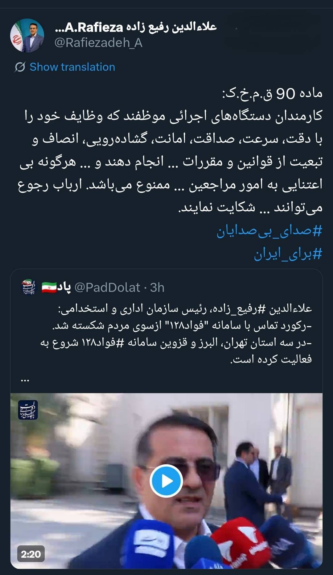 🔹دکتر علاءالدین رفیعزاده، معاون رئیس جمهور و رئیس سازمان اداری و استخدامی کشور: با توجه به برخی سوالات، تاکید می شود هیچ کدام از ادارات ارائه دهنده خدمات به مردم، تعطیل نیست.