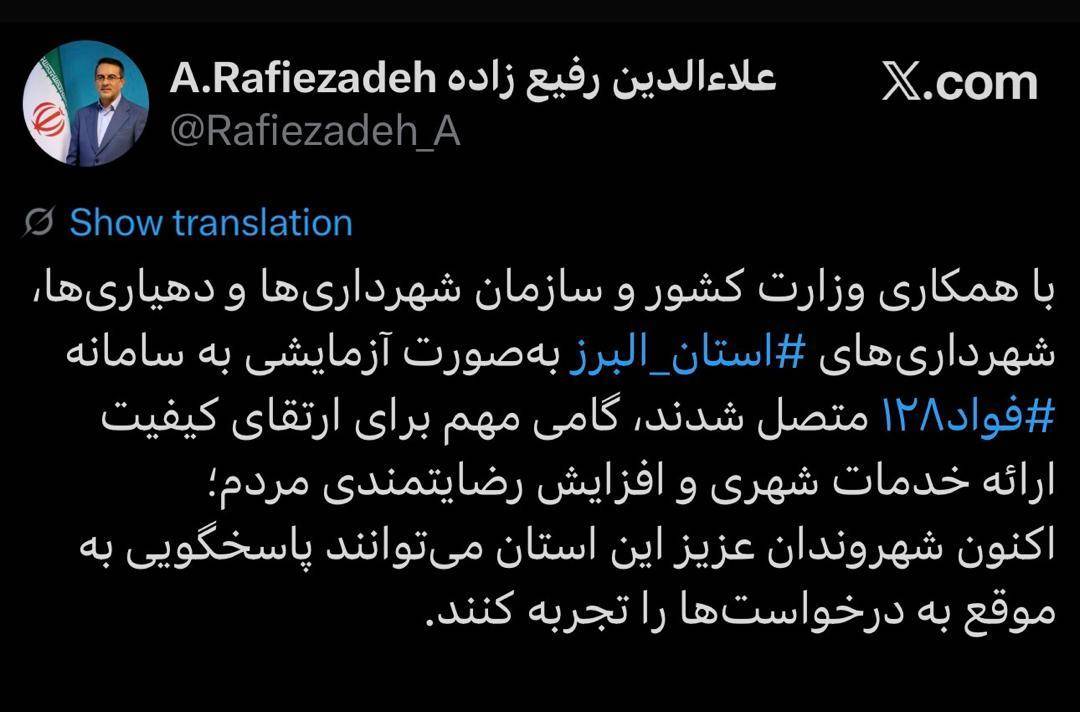 🔹️معاون رئیسجمهور و رئیس سازمان اداری و استخدامی کشور در فضای مجازی اعلام کرد که شهرداریهای استان البرز به صورت آزمایشی به سامانه فواد۱۲۸ متصل شدهاند؛ اقدامی که به گفته وی، گامی بزرگ در مسیر ارائه خدمات سریع و شفاف به مردم است.