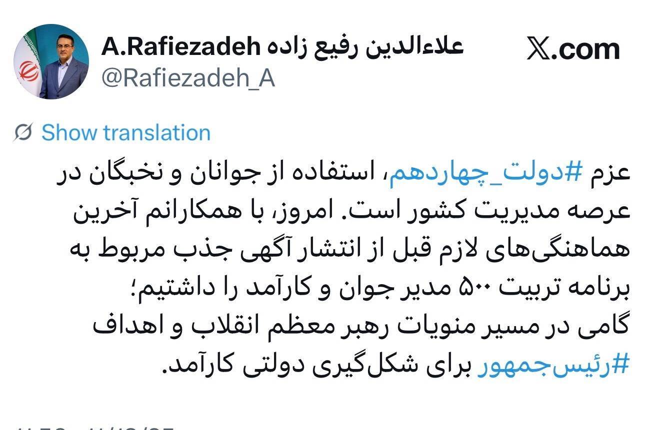 🔹️علاءالدین رفیعزاده در پیامی که در شبکه ایکس منتشر کرد نوشت: "عزم دولت چهاردهم استفاده از جوانان و نخبگان در عرصه مدیریت کشور است.