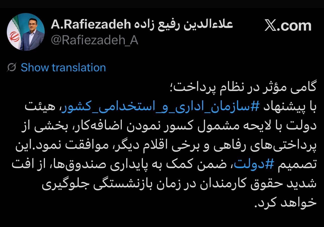 🔹دکتر علاءالدین رفیعزاده؛ معاون رئیسجمهور و رئیس سازمان اداری و استخدامی کشور، طی پیامی ضمن قدردانی از تلاش مجاهدانه دلاوران نظامی، کارکنان نظام اداری در دستگاههای اجرایی کشور، در شرایط فعلی، شهادت تنی چند از آنان بهویژه سه تن از #کارکنان شبکه خبر سیمای جمهوری اسلامی ایران و امدادگران هلال احمر را تسلیت گفت. متن کامل پیام به این شرح است: