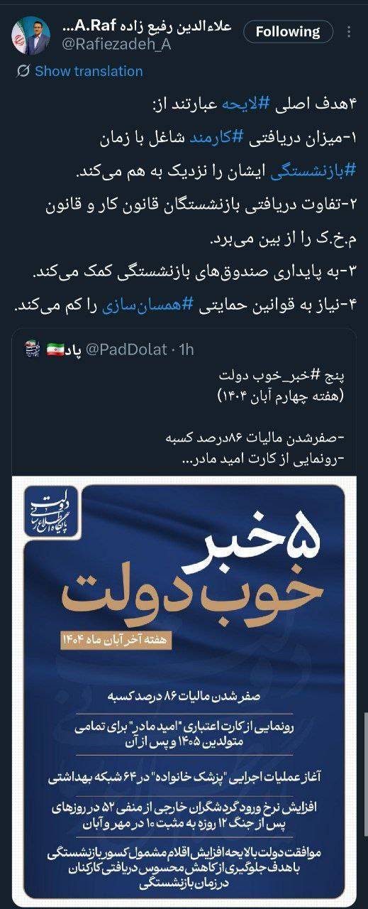 🔹️دکتر علاءالدین رفیعزاده با اشاره به اصلاح ماده ۱۰۶ قانون مدیریت خدمات کشوری گفت: «این لایحه، پرداختهایی از جمله فوقالعاده مناطق کمتر توسعهیافته و بد آب و هوا، اضافهکار، حقالتدریس غیرموظف معلمان و نوبتکاری را مشمول کسور بازنشستگی میکند. نتیجه این اقدام، نزدیکتر شدن حقوق بازنشستگان به دریافتی دوران اشتغال و تقویت منابع صندوقهای بازنشستگی است.