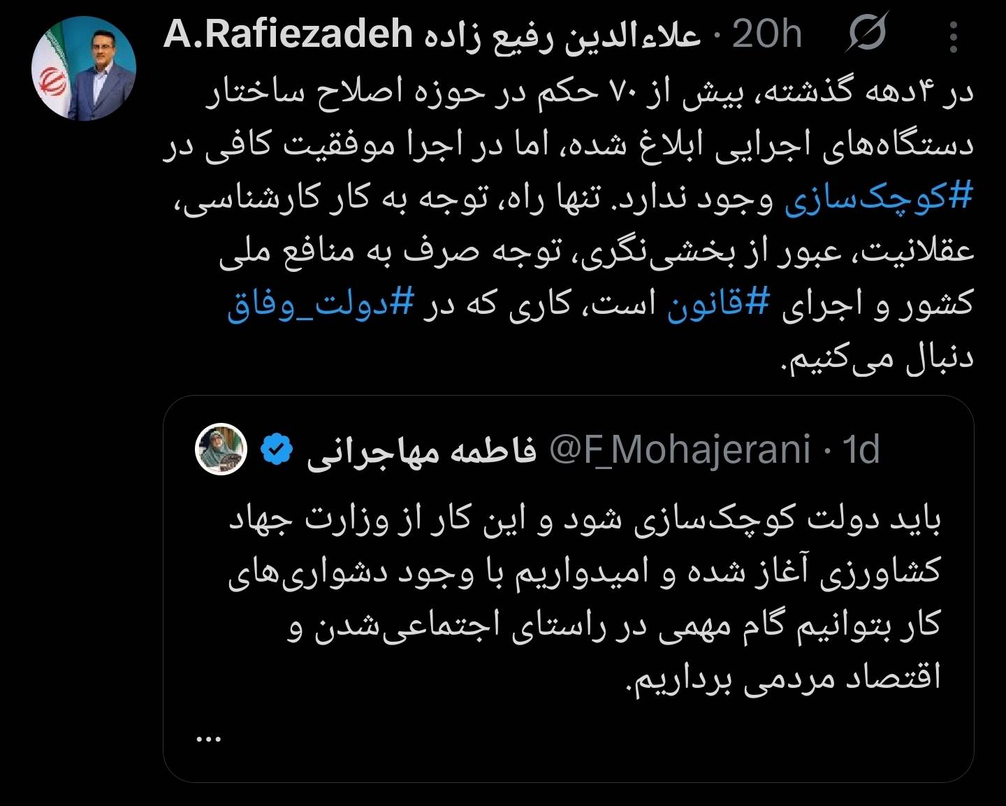 «در چهار دهه گذشته، بیش از ۷۰ حکم در حوزه اصلاح ساختار دستگاههای اجرایی ابلاغ شده است، اما در اجرا موفقیت کافی در #کوچکسازی وجود ندارد. تنها راه، توجه به کار کارشناسی، عقلانیت و عبور از بخشینگری است. توجه صرف به منافع ملی کشور و اجرای #قانون، کاری است که در #دولت_وفاق دنبال میکنیم.»