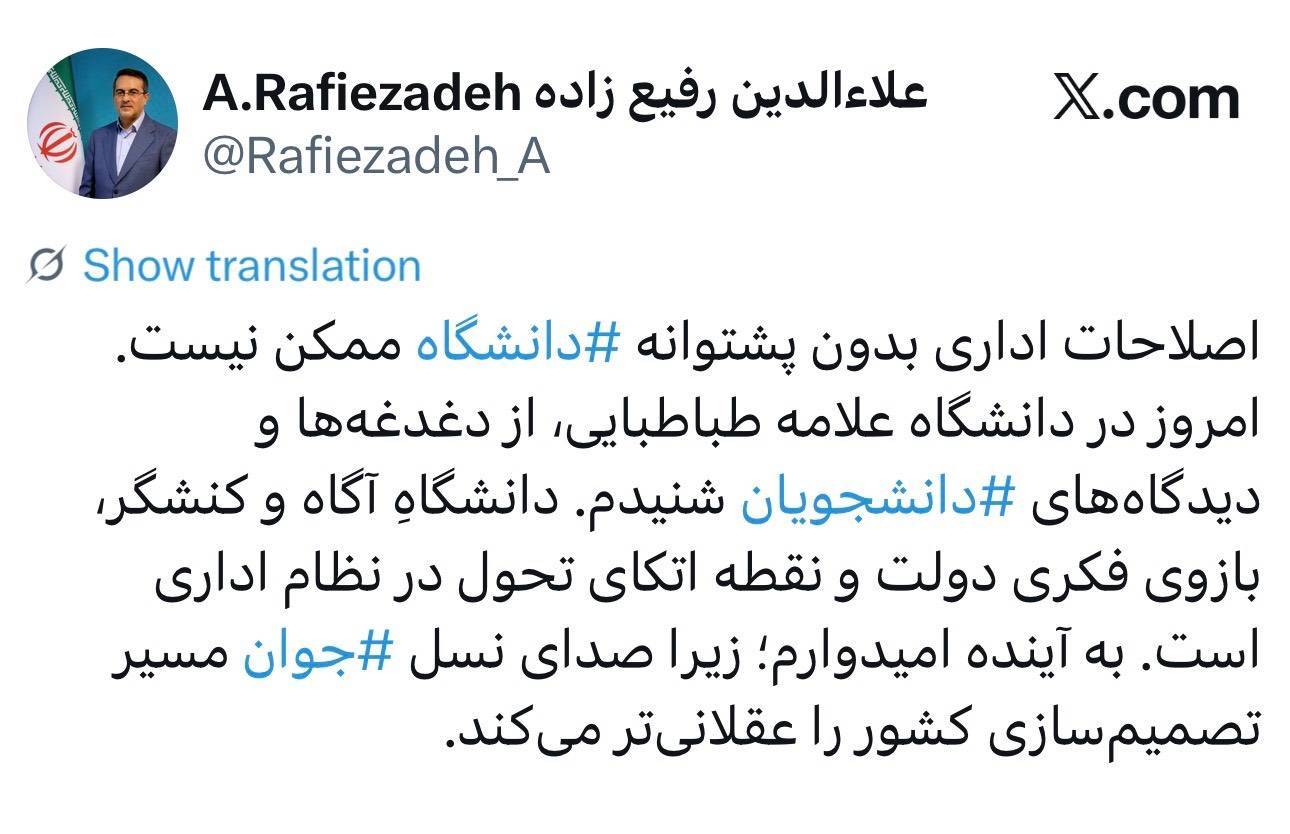 پس از حضور دکتر علاالدین رفیعزاده، معاون رئیسجمهور و رئیس سازمان اداری و استخدامی کشور، در جمع دانشجویان دانشگاه علامه طباطبایی و گفتوگوی بیواسطه با آنان در فضای صمیمی سلف دانشگاه، او در شبکه اجتماعی ایکس پیامی منتشر کرد.