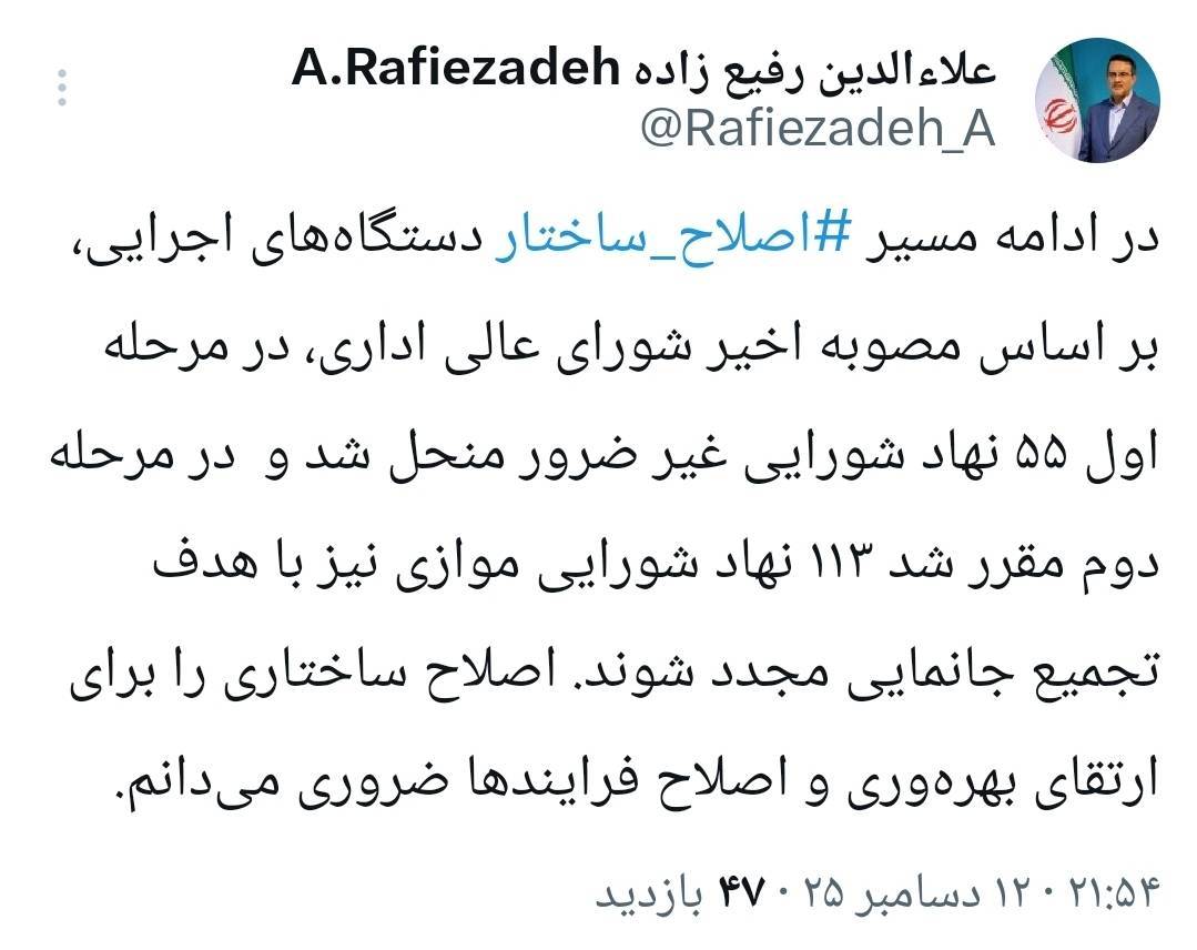 علاءالدین رفیعزاده، معاون رئیسجمهور و رئیس سازمان اداری و استخدامی کشور، با انتشار پیامی در شبکه اجتماعی ایکس اعلام کرد که در ادامه روند اصلاح ساختار دستگاههای اجرایی و بر اساس مصوبه اخیر شورای عالی اداری، مرحله نخست این طرح با انحلال ۵۵ نهاد شورایی غیرضرور آغاز شده است.