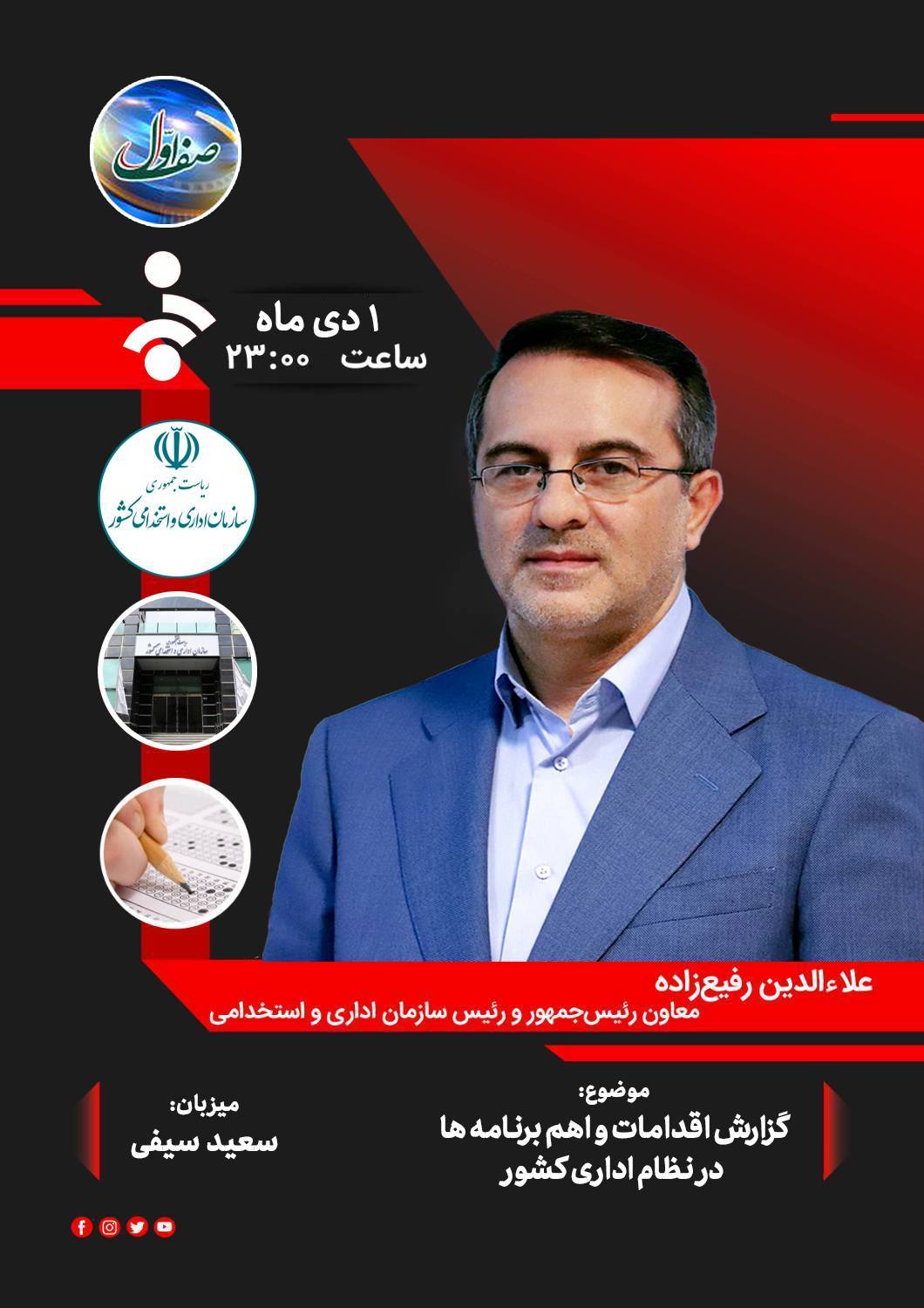 دکتر علاءالدین رفیعزاده معاون رئیسجمهور و رئیس سازمان اداری و استخدامی کشور امشب با حضور در برنامه صف اول به تشریح اقدامات و برنامه های سازمان اداری و استخدامی کشور خواهند پرداخت. این برنامه ساعت ۱۱شب بطور زنده از شبکه خبر پخش خواهد شد.